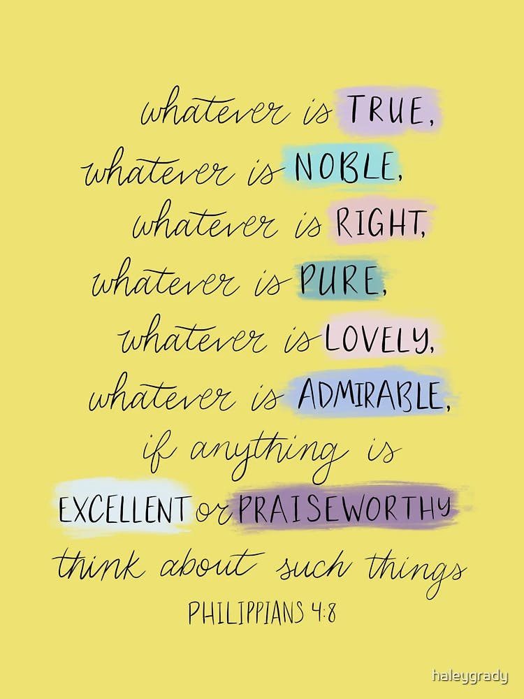 And now, dear brothers and sisters, one final thing. Fix your thoughts on what is true, and honourable, and right, and pure, and lovely, and admirable. Think about things that are excellent and worthy of praise. Philippians 4:8 (NLT)