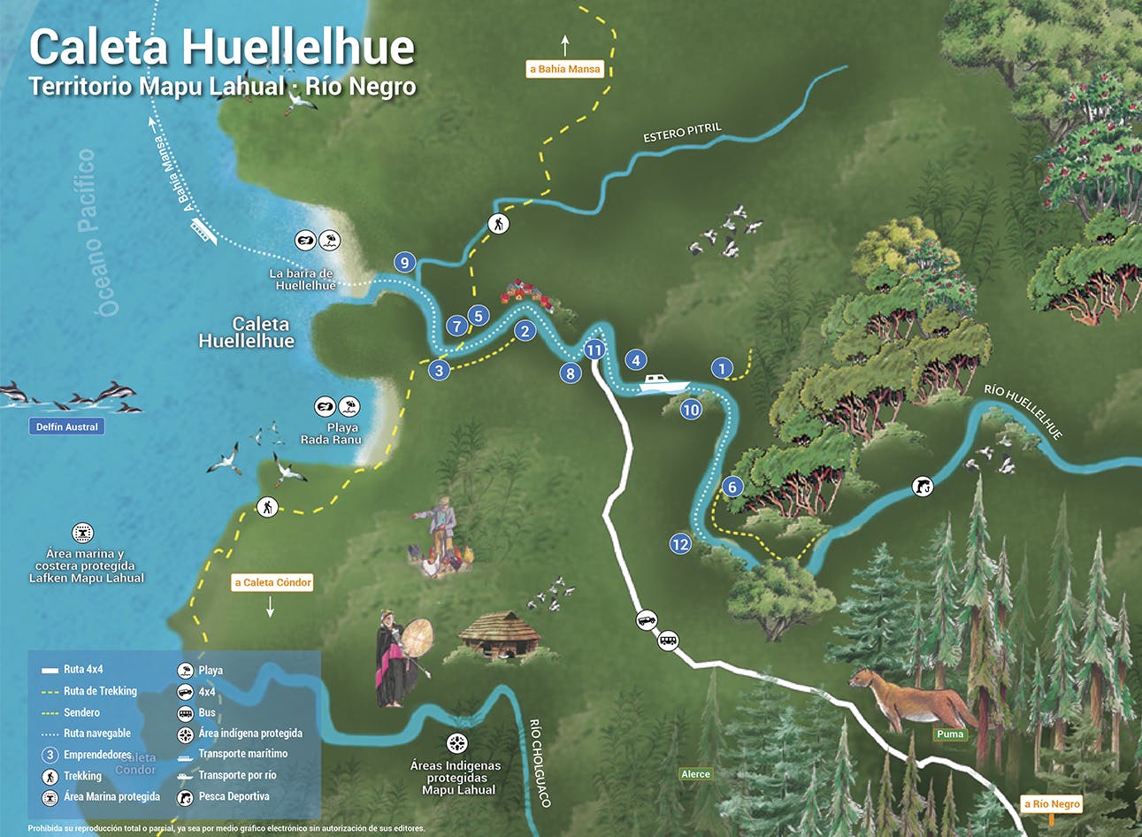 La Caleta Huellelhue, en la Costa de la Provincia de Osorno, comuna de Río Negro, es un hermoso valle con bosques de miles de verdes tonos, en la costa del mar con dos amplias playas vírgenes y acantilados. Aquí no hay camino de autos y queremos que continúe así.