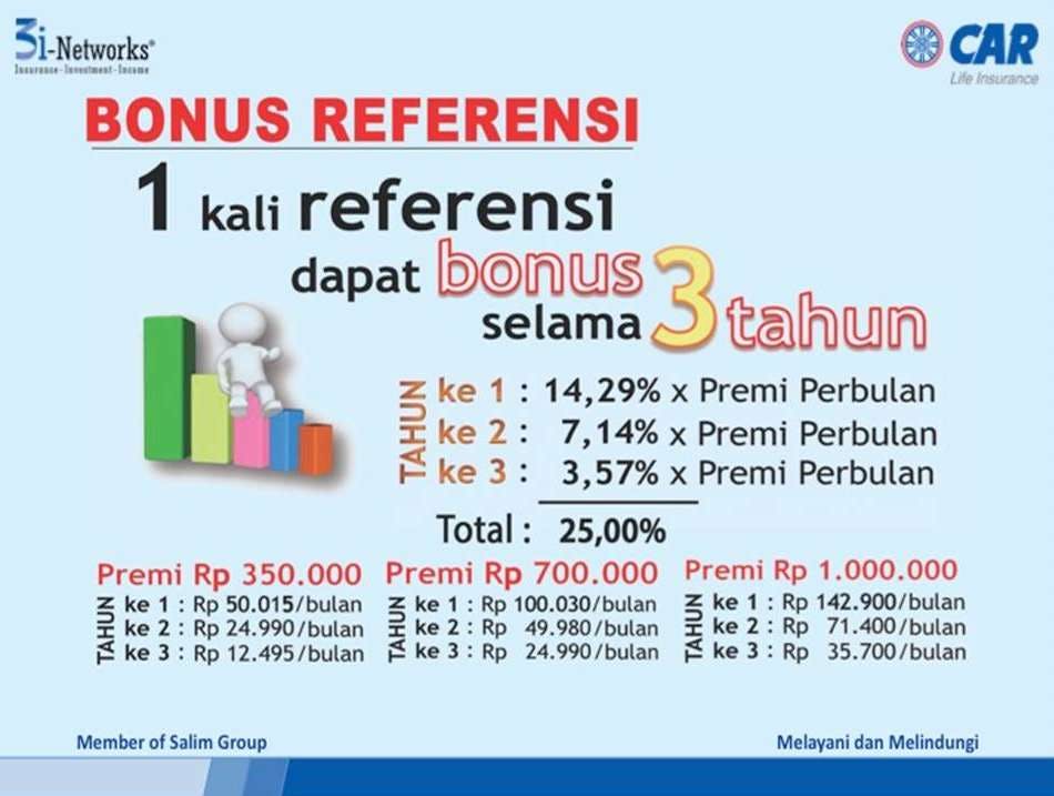 Bayangkan, hanya dengan mengajak 5 orang saja dalam satu bulan untuk menabung investasi dan proteksi, Anda berhak atas bonus 800rb-1jtan. Sungguh sesuatu yang mudah dicapai dan diduplikasi oleh mitra Anda sehingga bisnis Anda semakin berkembang dan bonus Anda semakin besar.